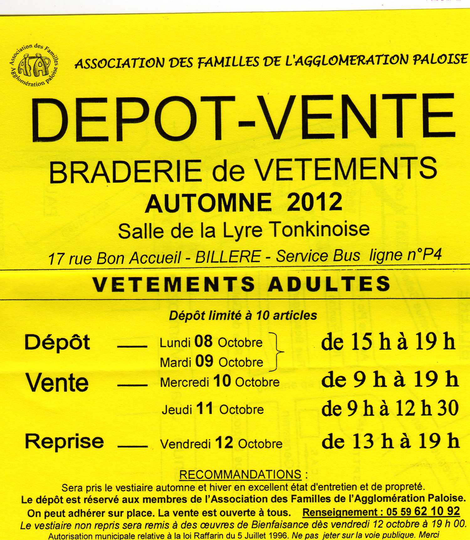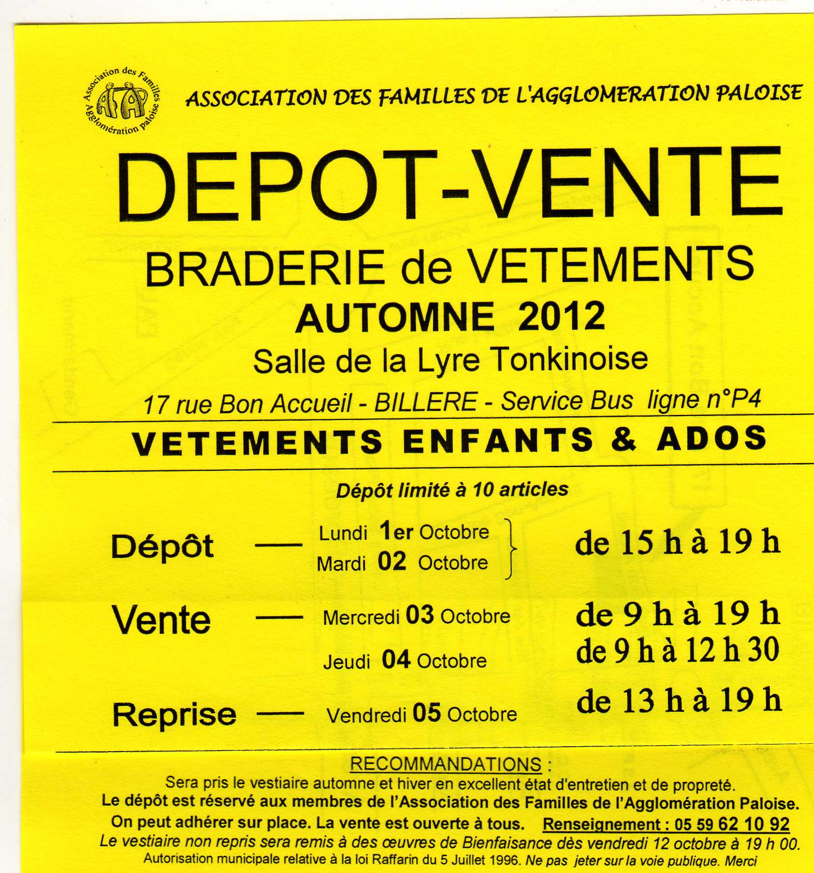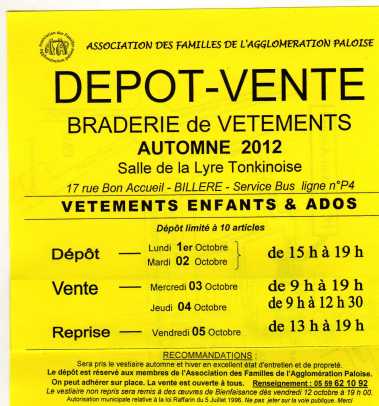 Le traditionnel dépôt-vente de l’AFAP aura lieu du 3 au 14 octobre 2011, salle de la Lyre Tonkinoise au 17, rue Bon Accueil à BILLERE. Service Bus, ligne n°P4